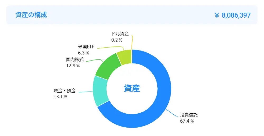 資産内訳は「現金・預金」「ドル資産」「投資信託」「国内株式」「米国ETF」の5つに分けて記録をしています。